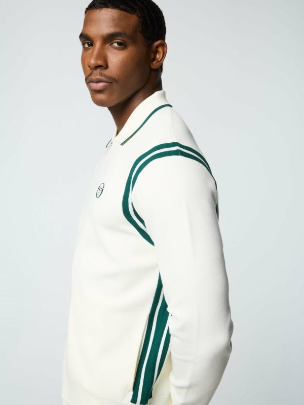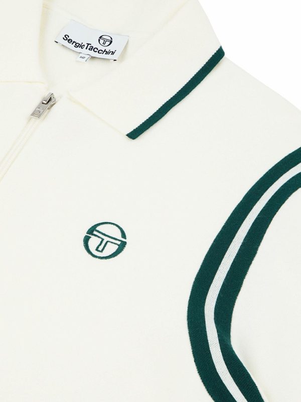 - Rib-knit fold-down spread collar w/ contrast tipping stripe