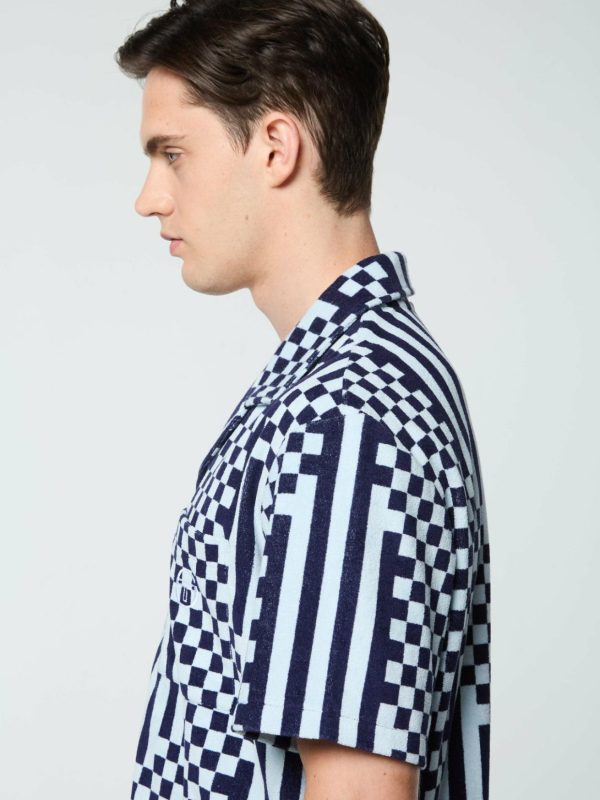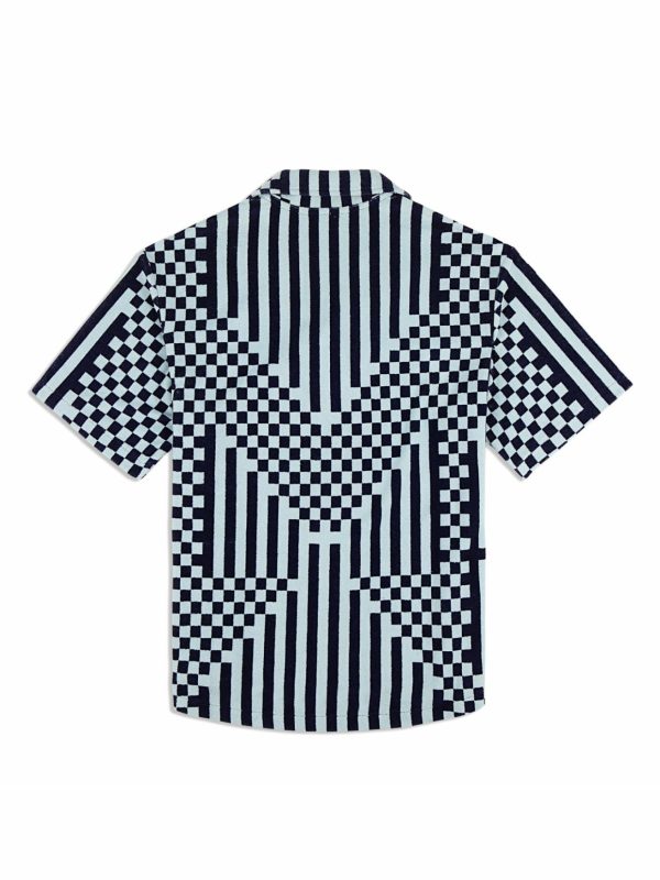 Elevate your wardrobe with our premium Piastrella Terry Cabana Shirt. A nod to luxury resort loungewear, this casual camp collar button-up is crafted from super plush terry toweling and features a retro two-tone geometric all-over pattern.
